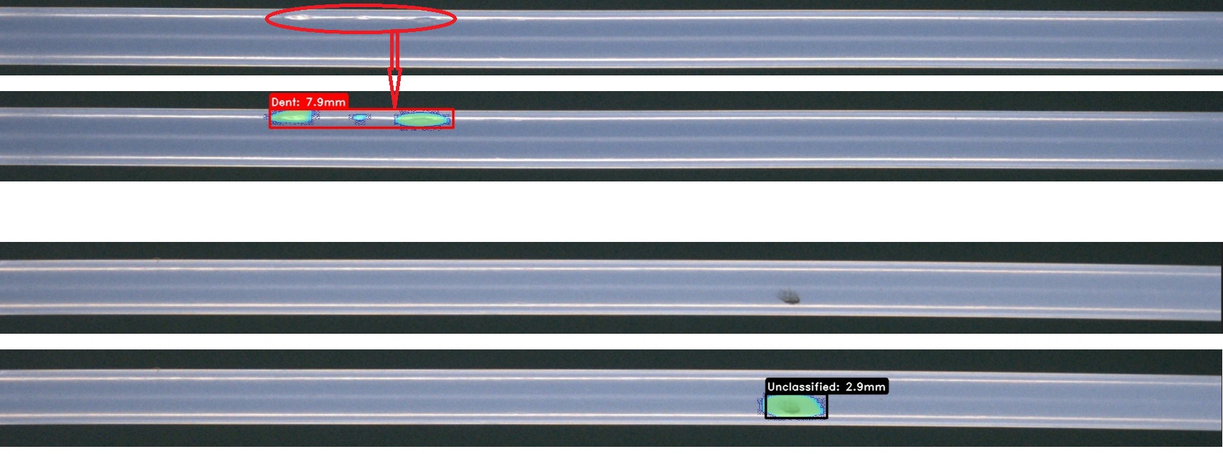 Surface inspection Breaks, cracks, cuts, holes, dents, pimples | Knots & Diameter Deviations Detection of Knots & Necking | Checking color Single color, multicolor, gradient, rotating | Inspecting imprints Markings, codes, lettering, serial numbers |