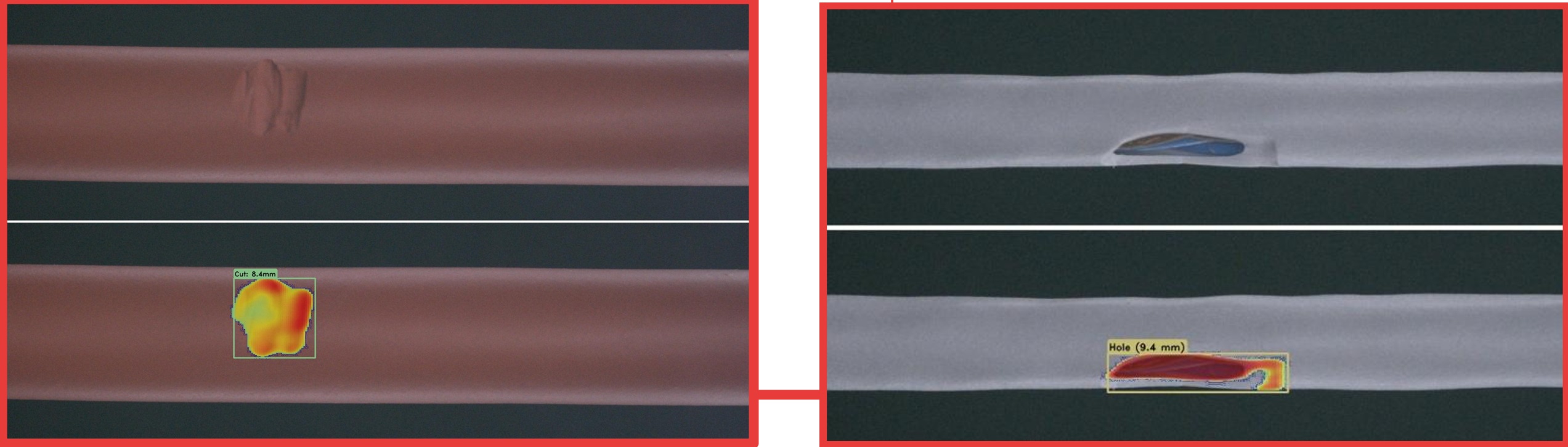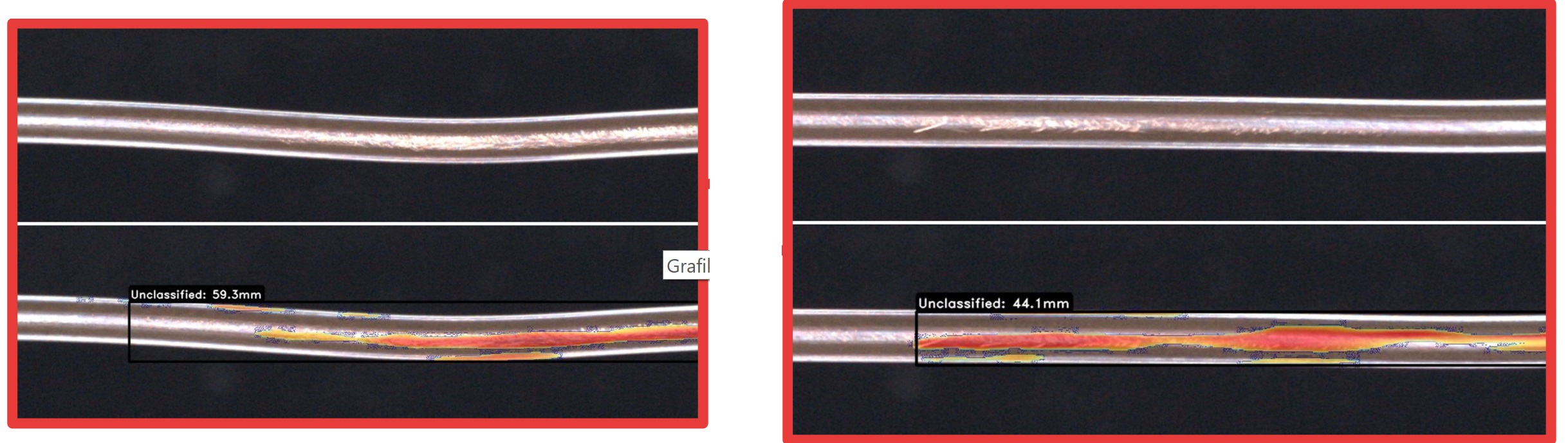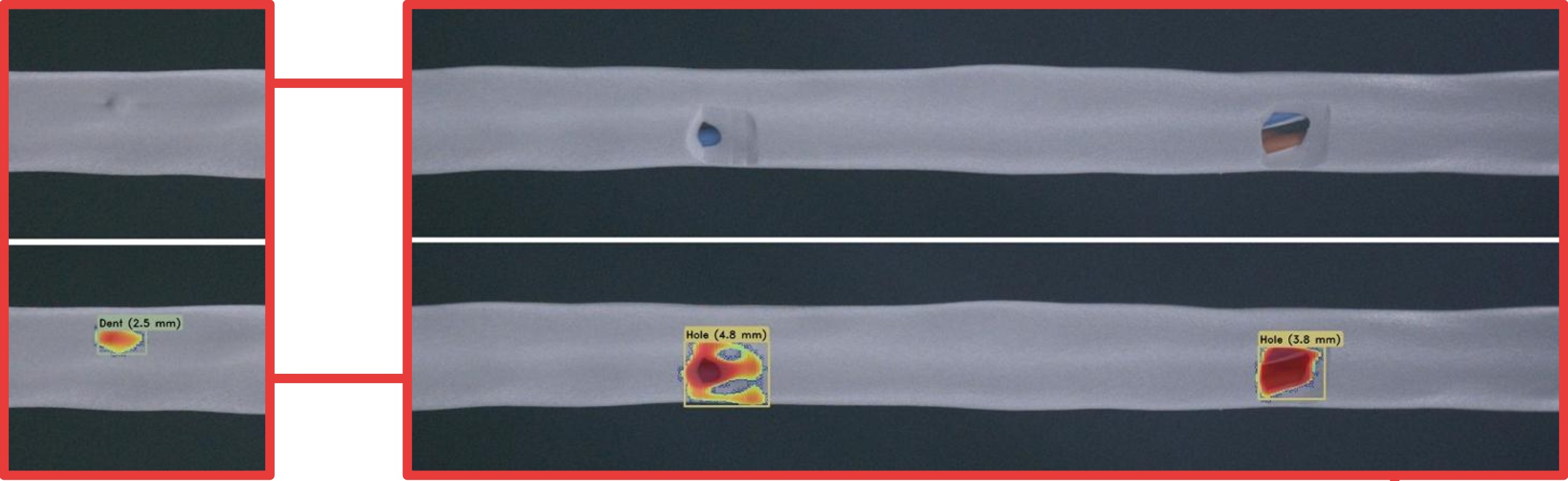 Kiểm tra bề mặt Vết nứt, vết cắt, lỗ thủng, vết lồi lõm, xước, gờ, ba-via | Độ lệch đường kính Phát hiện nút thắt và thắt nút, sai lệch đường kính | Kiểm tra màu sắc Một màu, nhiều màu, chuyển màu, xoay | Kiểm tra dấu in Nhãn hiệu, mã, chữ, hoặc số sê ri |