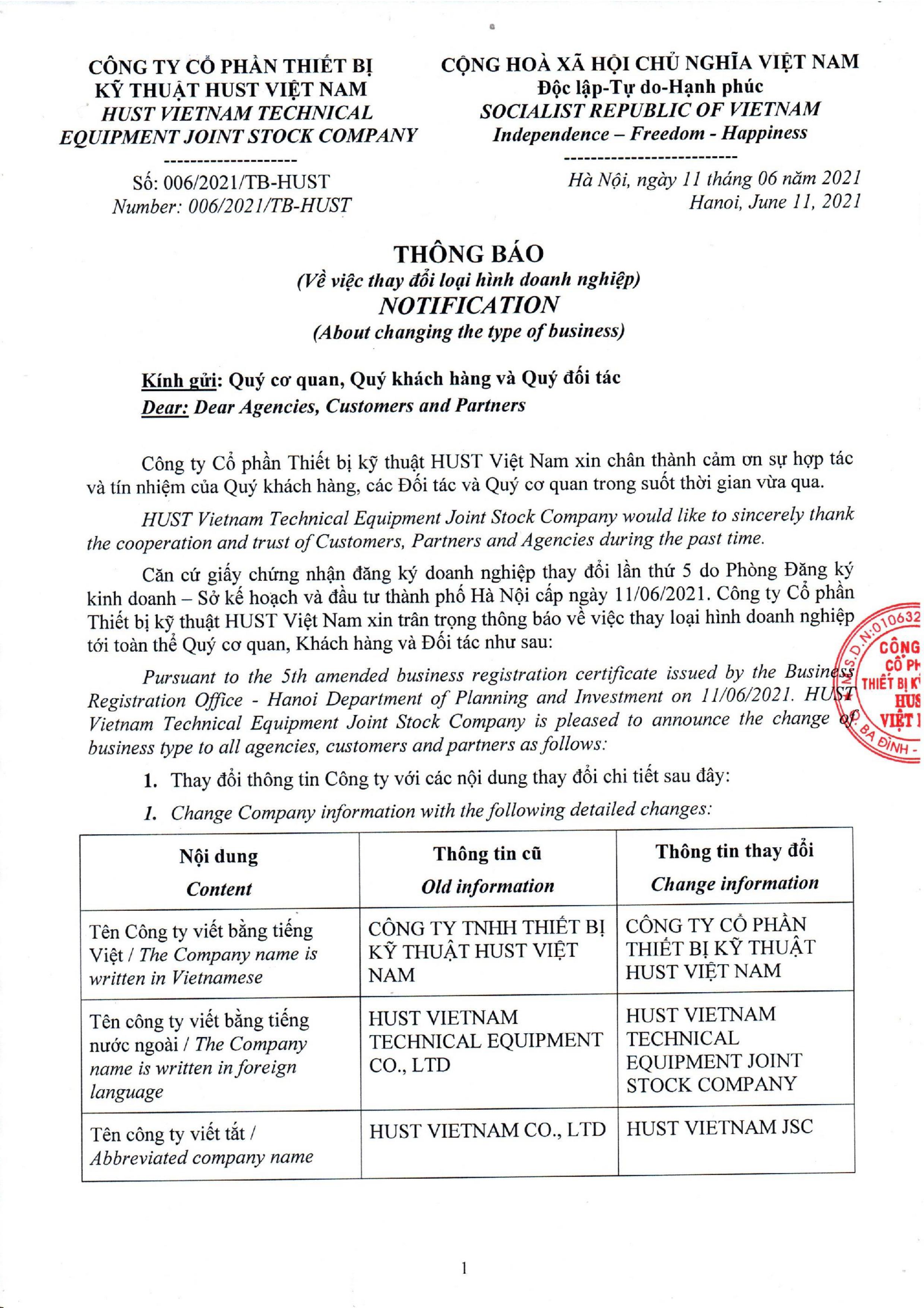 Vậy HUST Việt Nam xin trân trọng thông báo để thuận tiện cho việc giao dịch với Quý khách hàng, đối tác và các cơ quan ban ngành!