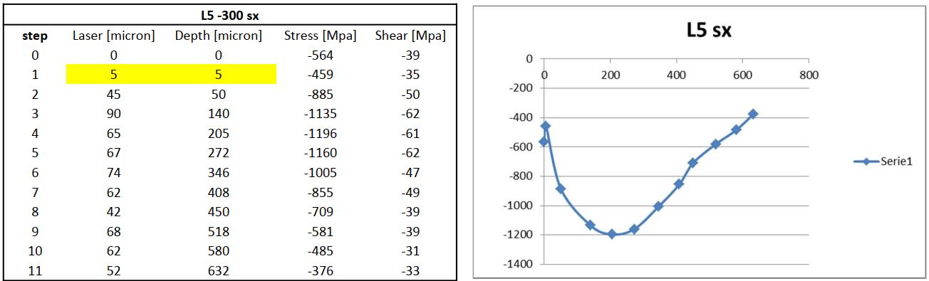 - Hai lá nhíp được đánh dấu L5 và L6 đến từ quá trình xử lý nhiệt tương tự như trên và sau đó phun bi đã được đo trên bề mặt và ở các biên dạng độ sâu khác nhau. Phép đo đã được thực hiện tại hai điểm đối xứng cách lỗ tâm 300 mm